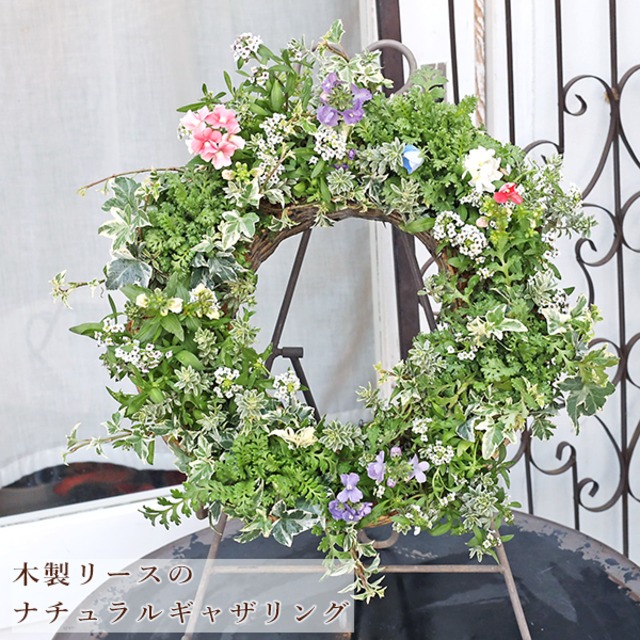 現品販売 花寄せ植え ネモフィラ&アリッサム&ネメシア ギャザリング 木製リース30cm ナチュラル おしゃれ 壁に掛ける ガーデン 飾る フラワー プレゼント ギフト