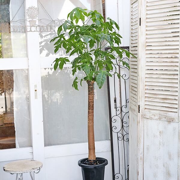 手のひらを広げたような明るいグリーンの葉、幹は太く安定感があります。