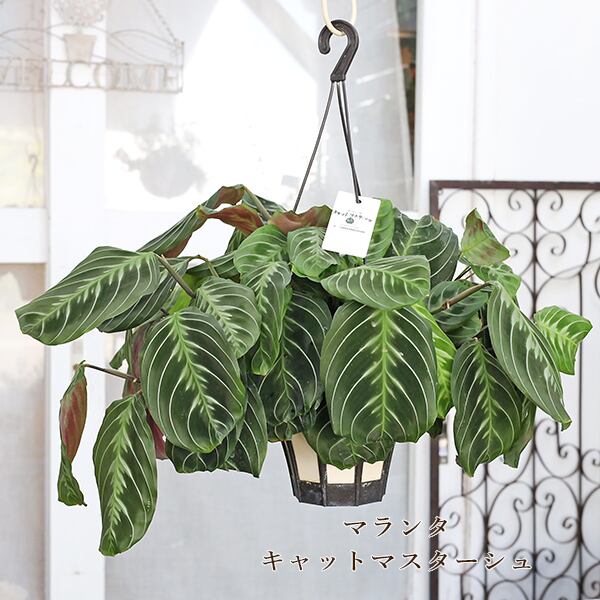 マランタ キャットマスターシュ…濃い緑の独特な模様が入る容姿が個性的でインパクトがあります。熱帯植物なので高温多湿な気候を好み夏はよく成長します。冬は室内で管理します。