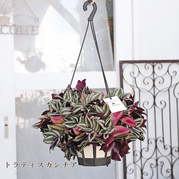 トラディスカンチア…ゼブラのように縞模様と葉裏の紫色が美しい。日に当たると光沢のある葉が鮮やかに発色します。性質は丈夫で暑さにも強く育てやすい。冬は霜を避けて暖地では屋外で越冬します。