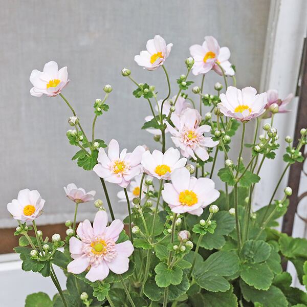 半八重咲きパステルピンク色の可愛らしいシュウメイギク「さくらこ」です。