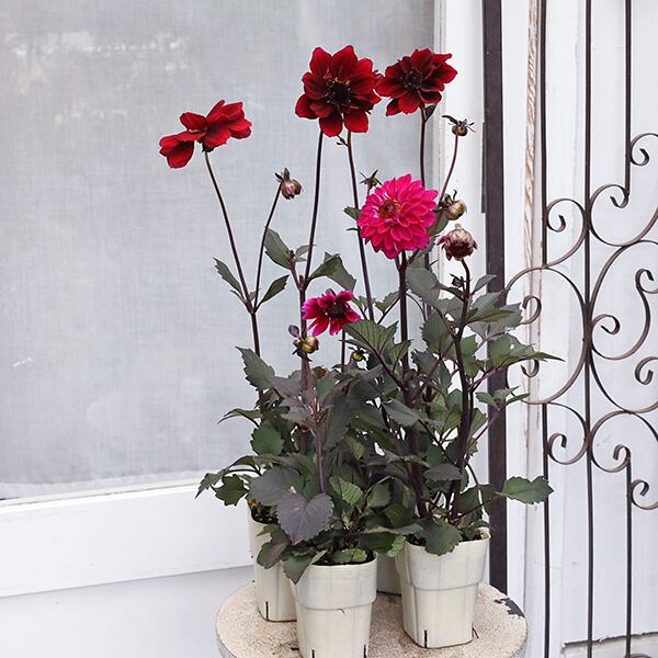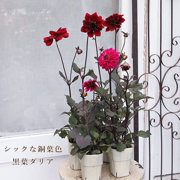 シックな黒葉にダークレッド色またはローズ色の落ち着いた色合い、華やかな八重咲きの花が咲くダリアのシリーズです。