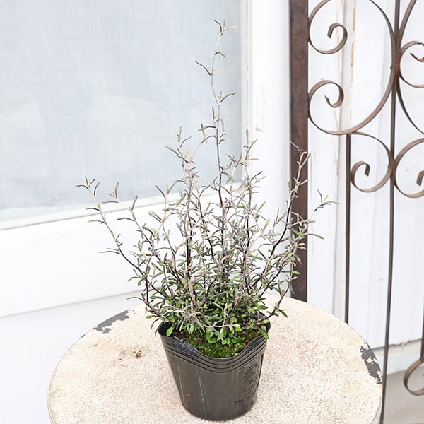 ワイヤーのようなグレー色の細い枝と小さなシルバーグリーンの葉、全体的にシルバーとダークグレーの落ち着いた印象の常緑樹です。