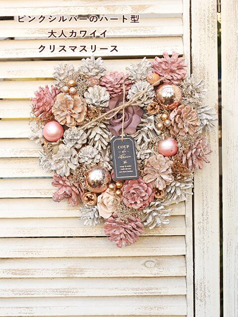 クリスマスリース ピンク&ホワイト Sサイズ ハート型の天然素材ドライリースです。