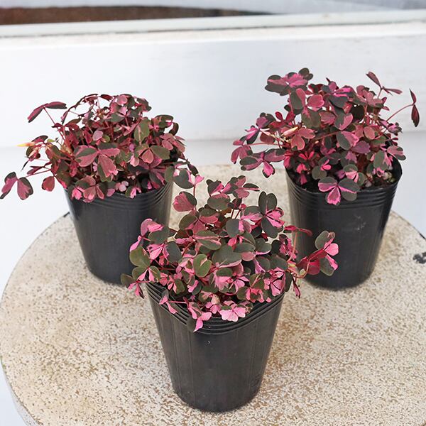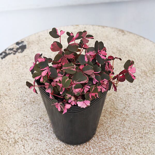 クローバーのような三つ葉の葉はダークグリーンとピンクの斑入りシックな印象のオキザリスです。