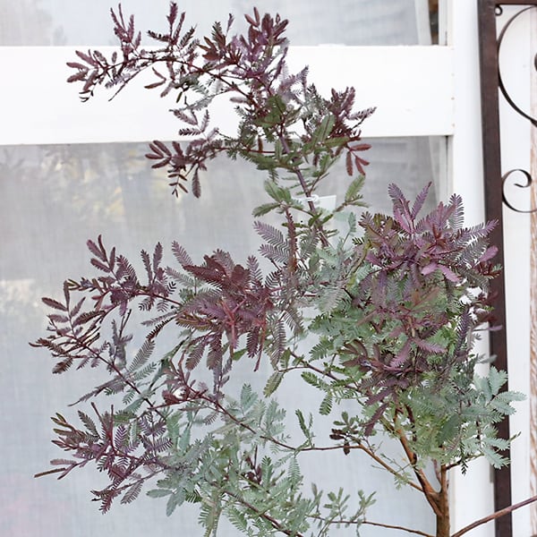 葉先が赤紫銅葉と銀青色の葉のコントラストが美しいアカシア ベイリアナプルプレア。
