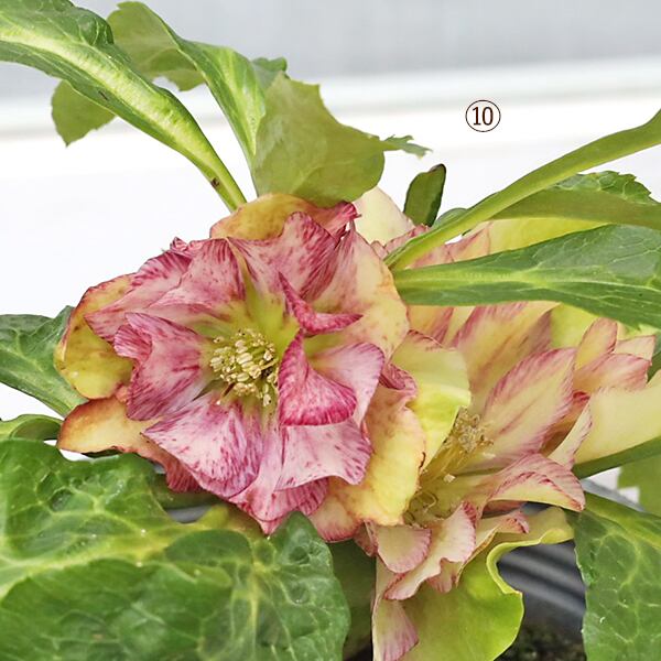 10番…クリーム色にワインレッドの絞り柄八重咲き。