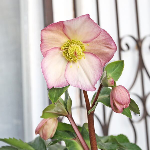 咲き始めはホワイトにピンクの縁取りのピコティーから、徐々にピンク色に変化する優しい印象のクリスマスローズ「雪の妖精」です。