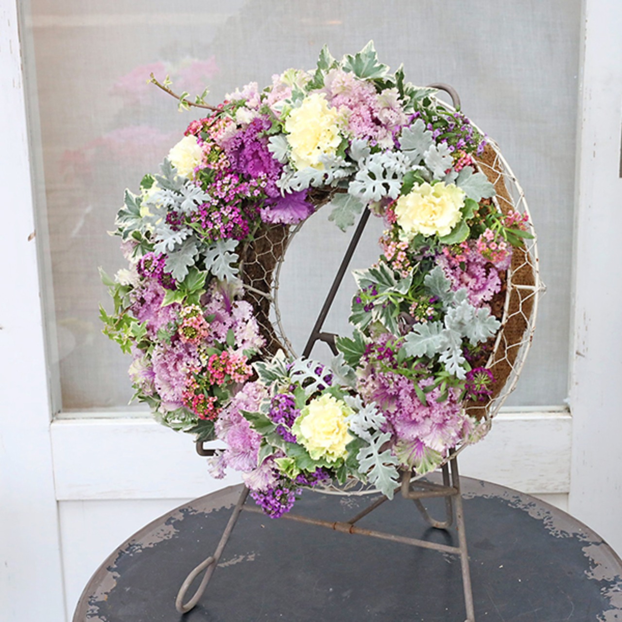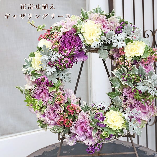現品販売 花寄せ植え ハボタン ギャザリングリース仕立て 35cm おしゃれ ナチュラル 壁に掛ける ガーデン 飾る フラワー プレゼント ギフト
