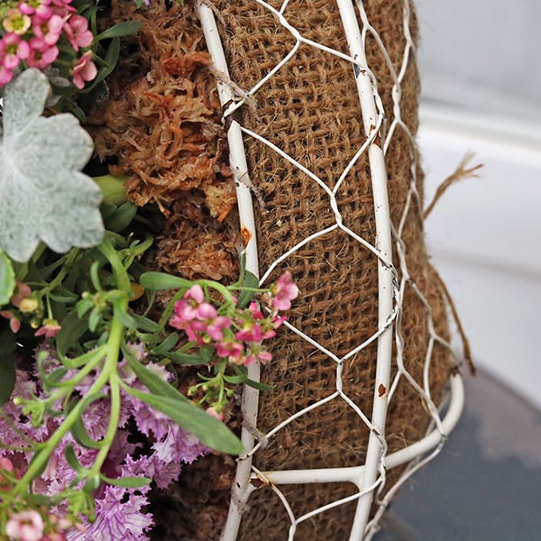 ハボタン・ピーチフラッシュ、ハボタン・ペティクリーム、アリッサム、シロタエギク、ヘデラ・こもれびを使ってギャザリング(寄せ植え)リースを作りました。