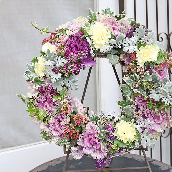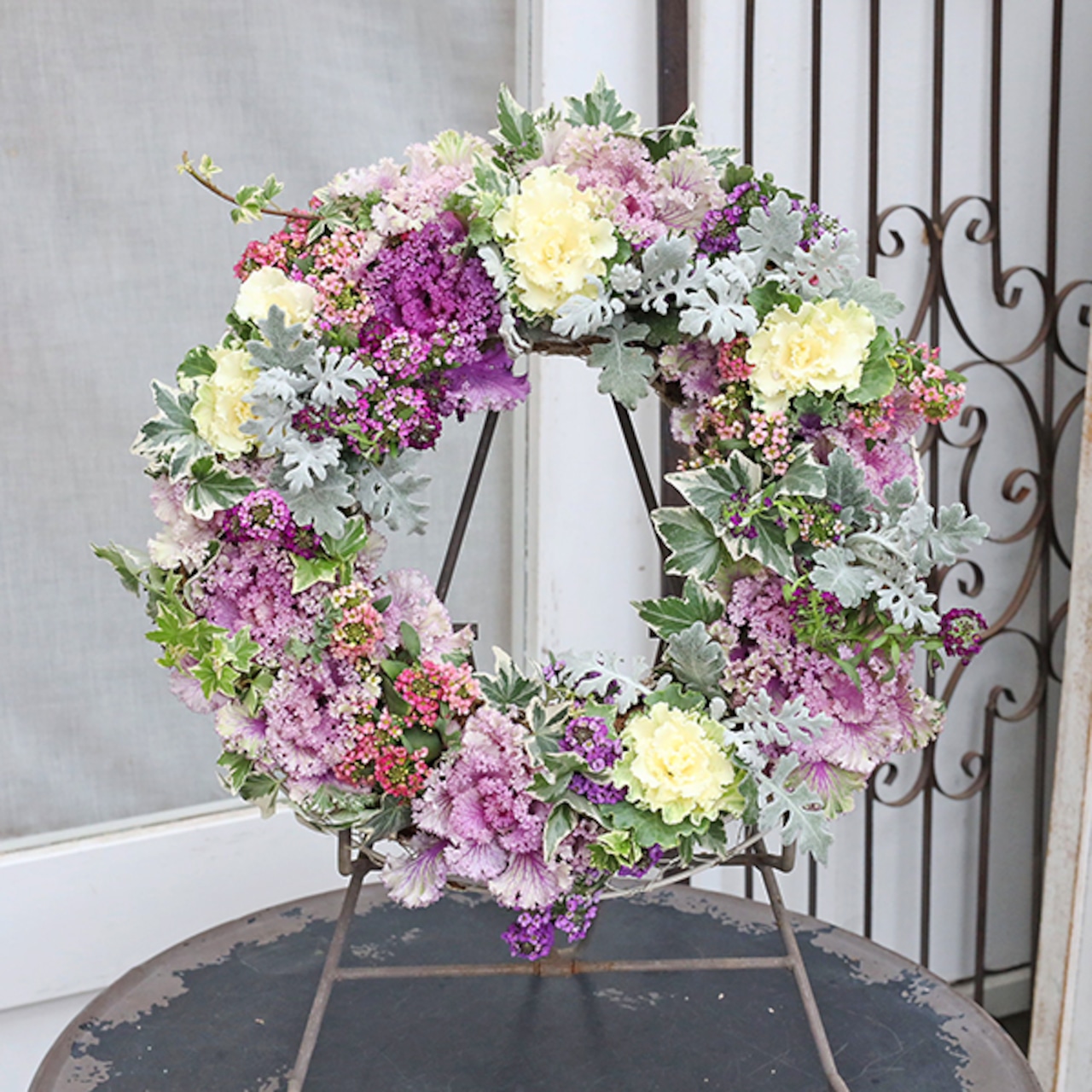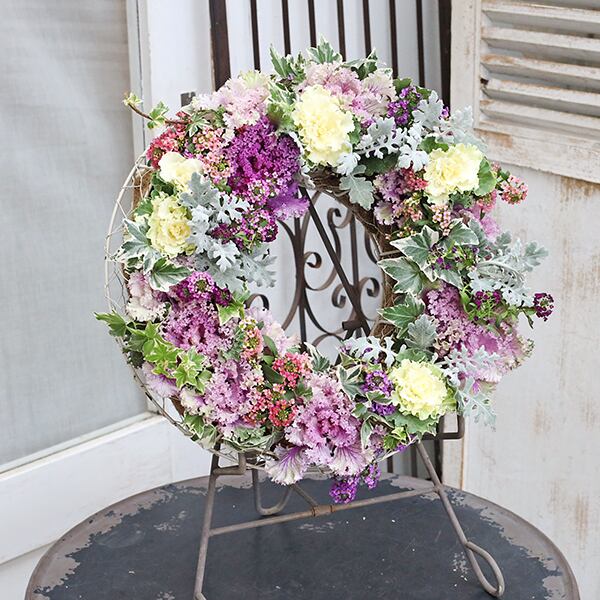現品販売 花寄せ植え ハボタン ギャザリングリース仕立て 35cmです。