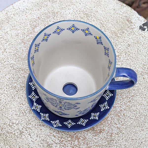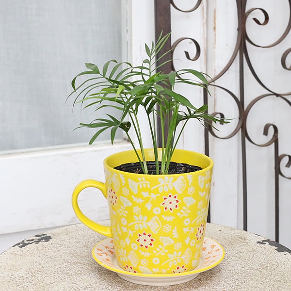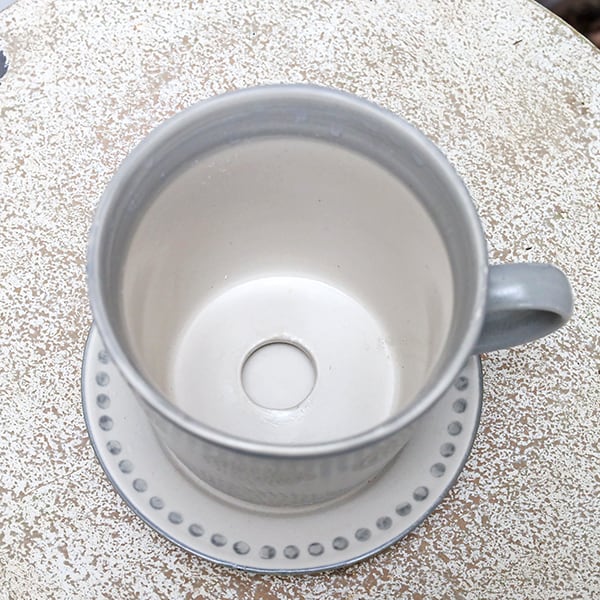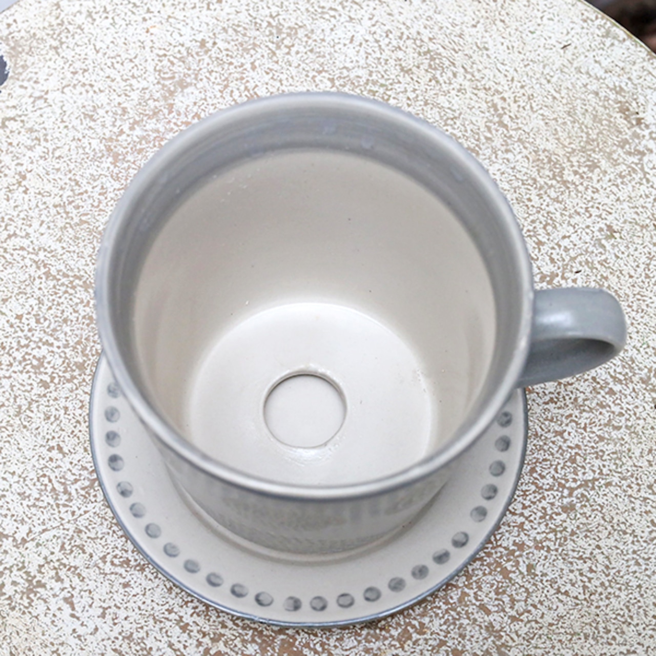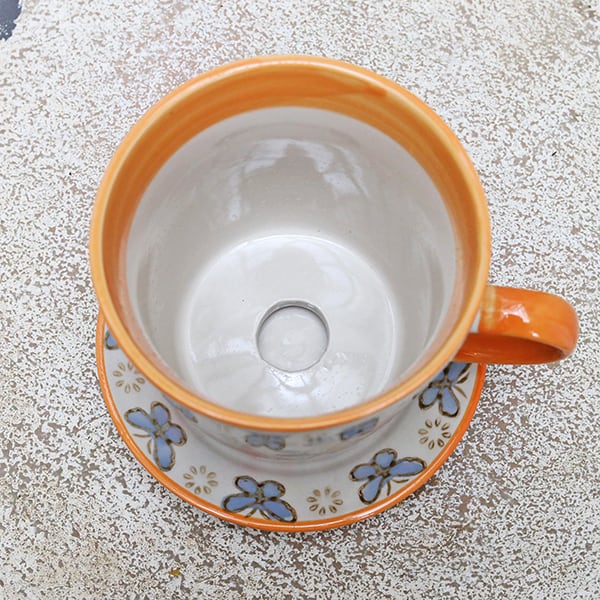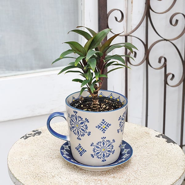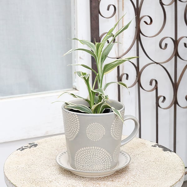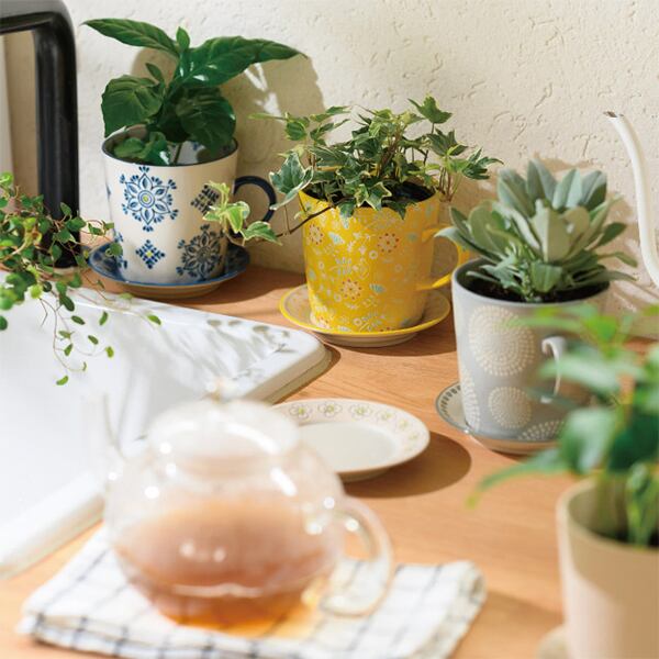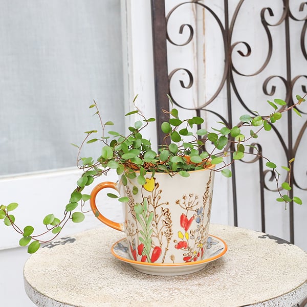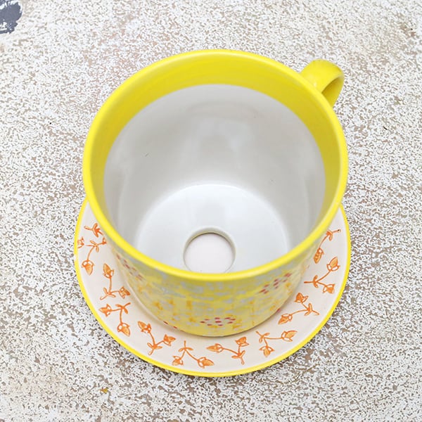 可愛いカップ&ソーサー型の底穴付きフラワーポットです。約3号(9cmポット)の植物が入ります。