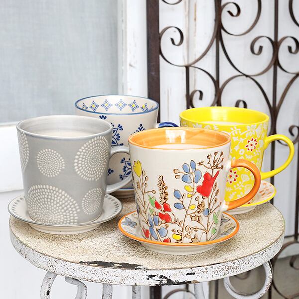 鮮やかなイエローはフラワー&リーフ柄、オレンジはふちとふんわり花柄お皿に蝶々柄、ブルーは花柄デザイン、グレーはうずまきドット柄。
