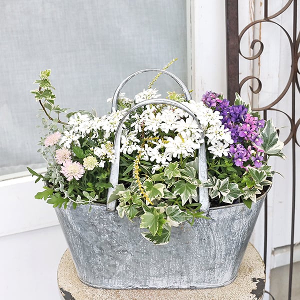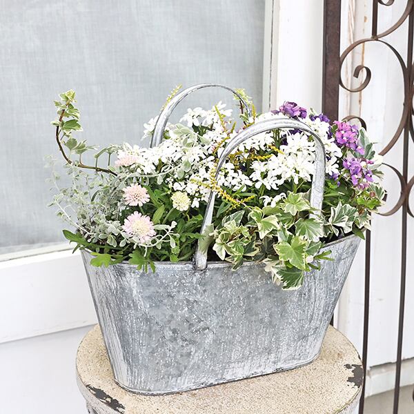容器はアンティーク風シャビーグレー色、持ち手の付いたバッグのようなブリキバスケットです。