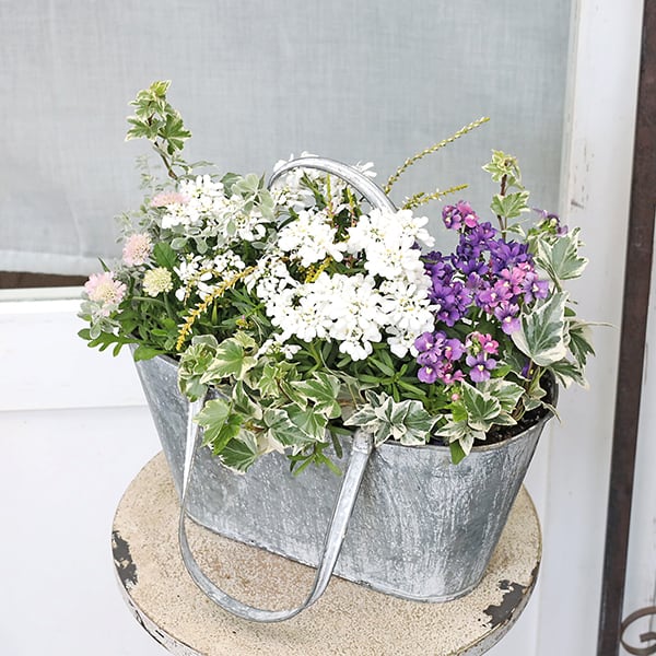 イベリス・ウィスラー、ネメシア・ディープブルー、スカビオサ・白ときどき桃、オレアリア・リトルスモーキー、カルーナ、ヘデラ・こもれびの季節の花寄せ植えです。