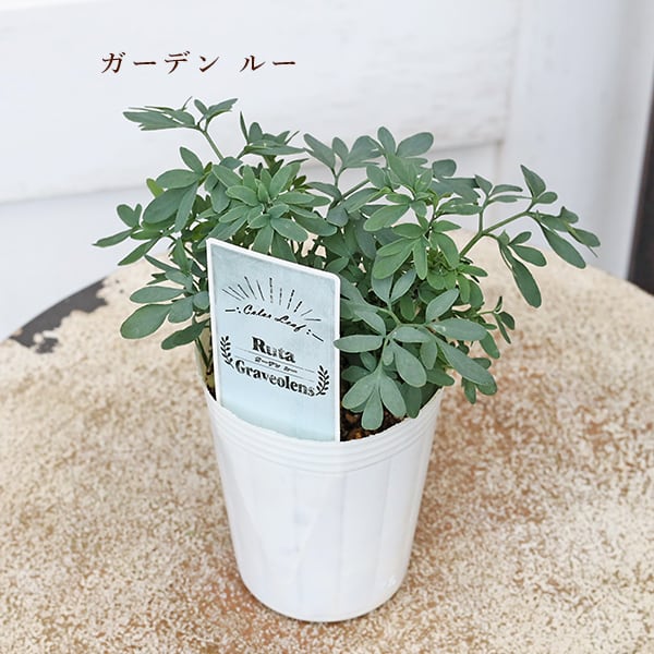 ガーデンルー…ブルーグリーンの葉が丸く茂る。独特の香りがする。ハーブの仲間。耐寒性常緑低木 ミカン科
