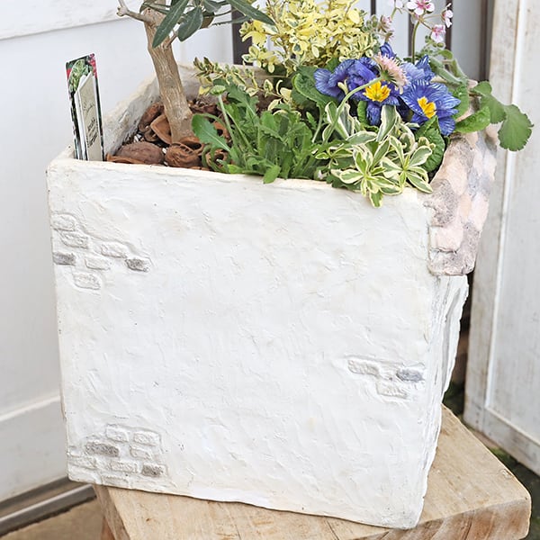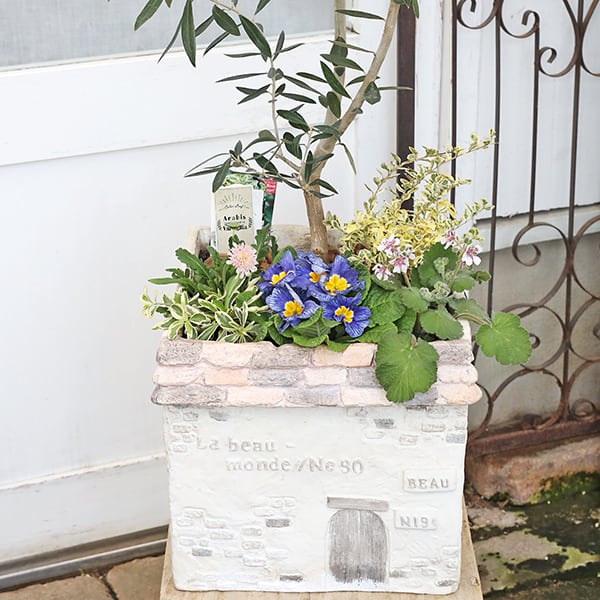 現品販売 オリーブの木 季節の花寄せ植え アラビス&エロディウム HOUSE型ナチュラルテラコッタです。