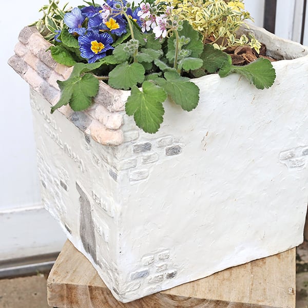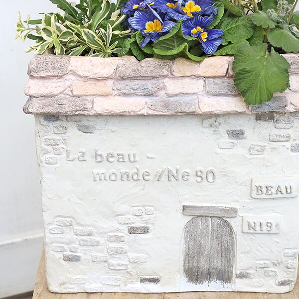 鉢はおしゃれなハウス型デザイン、テラコッタ調のグラスファイバー製です。