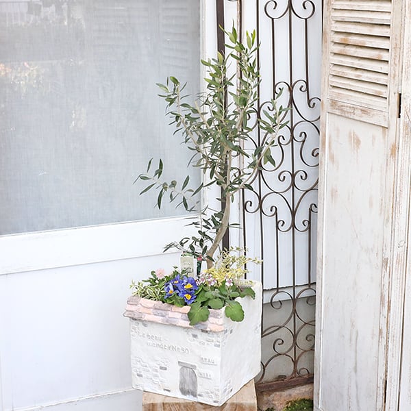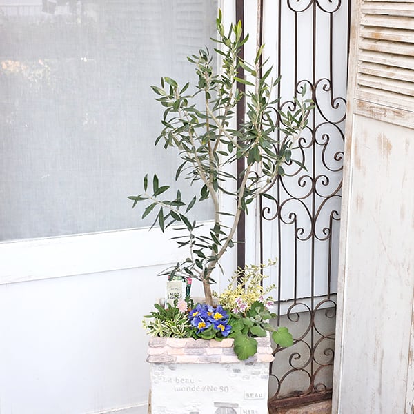 オリーブ・コロネイキをメインに季節の花でナチュラルな印象の寄せ植えに仕上げました。