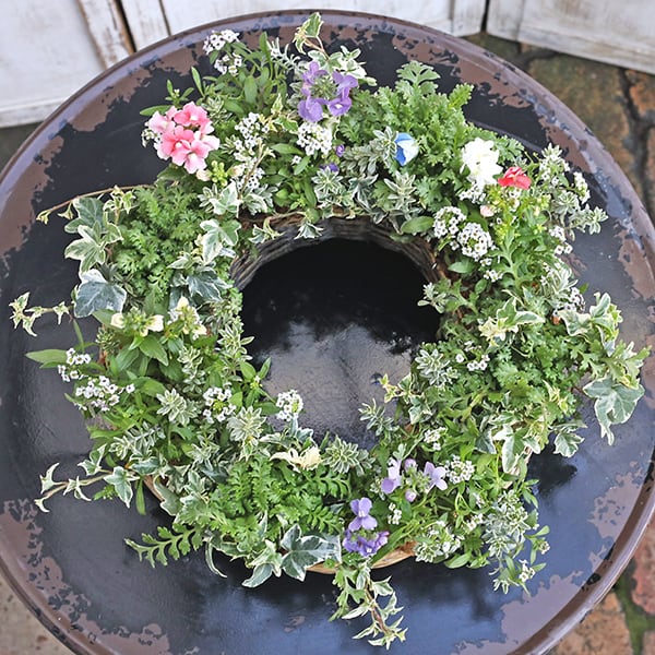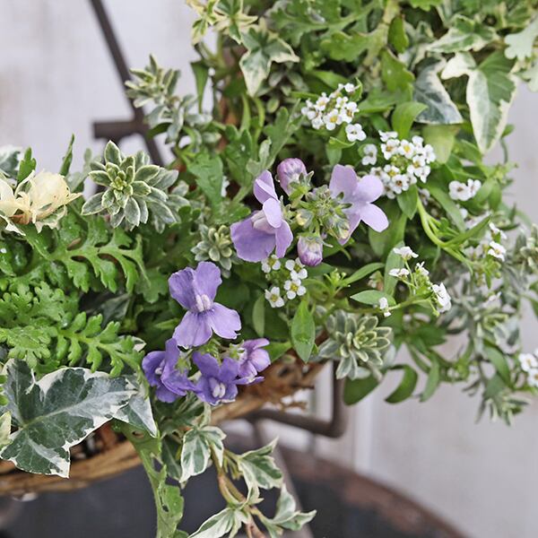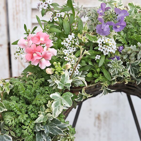 ネモフィラ・インシグニスブルー、アリッサム、ネメシア3色、ウエストリンギア、ヘデラ・天使のいたずらを使ってナチュラルなギャザリング(寄せ植え)リースを作りました。
