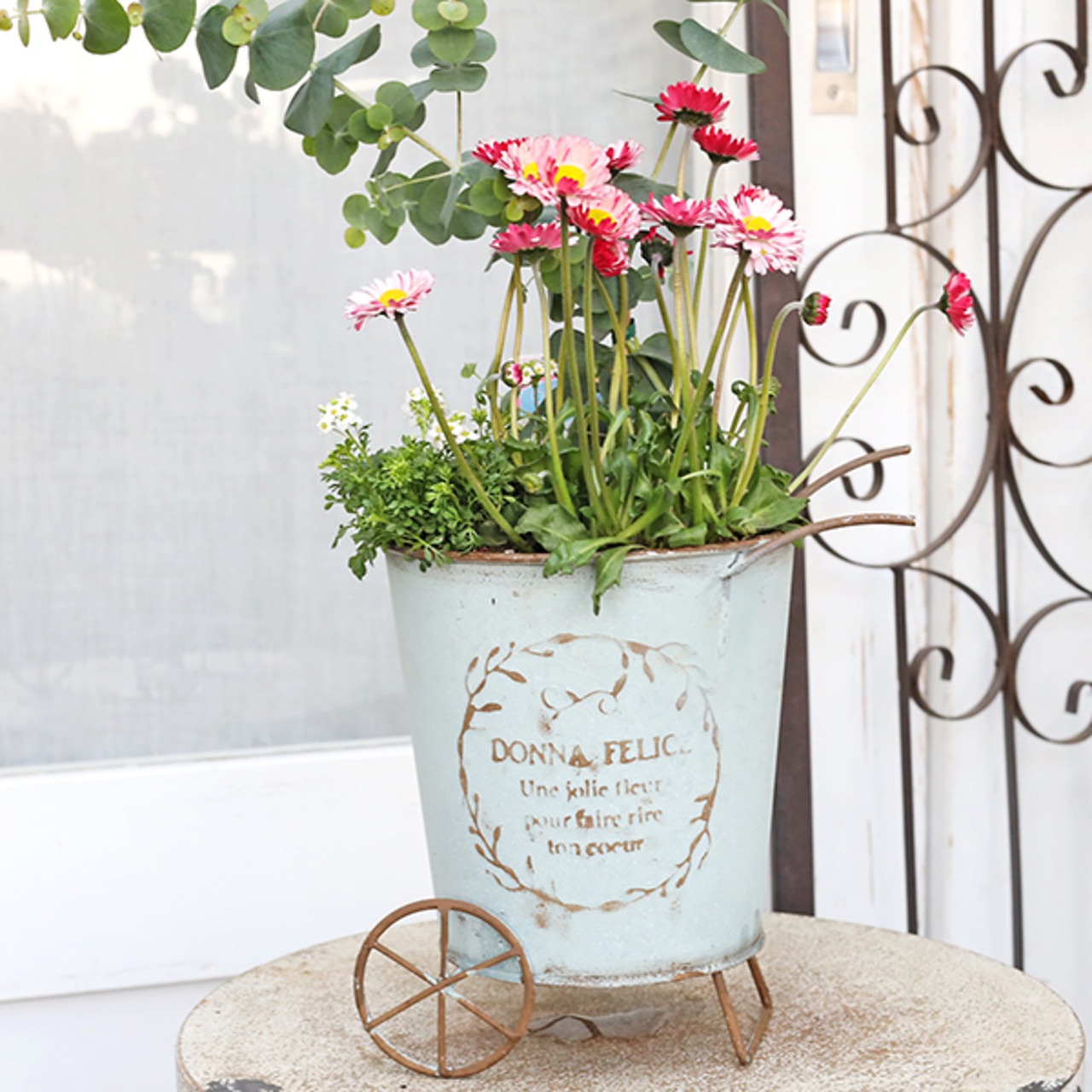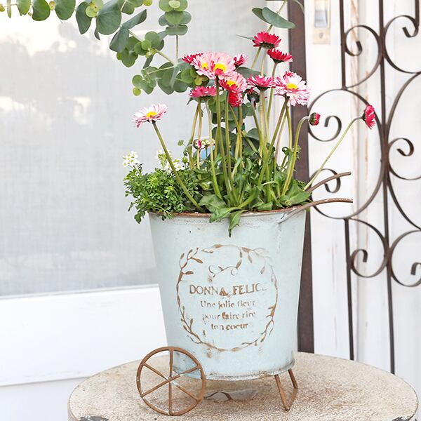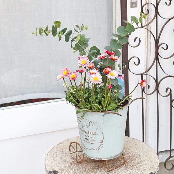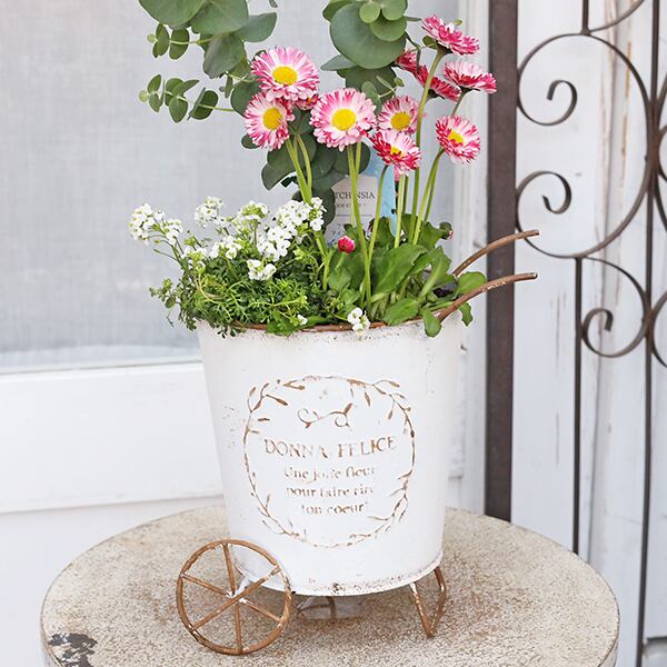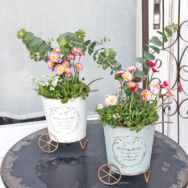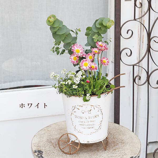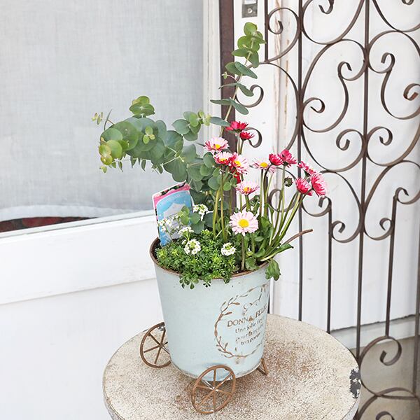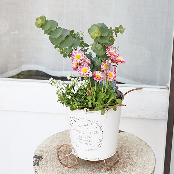 現品販売 季節の花寄せ植え ユーカリ&イングリッシュデージー ナチュラルブリキカートです。