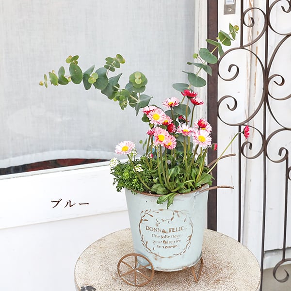 現品販売 季節の花寄せ植え ユーカリ&イングリッシュデージー ナチュラルブリキカート blue white