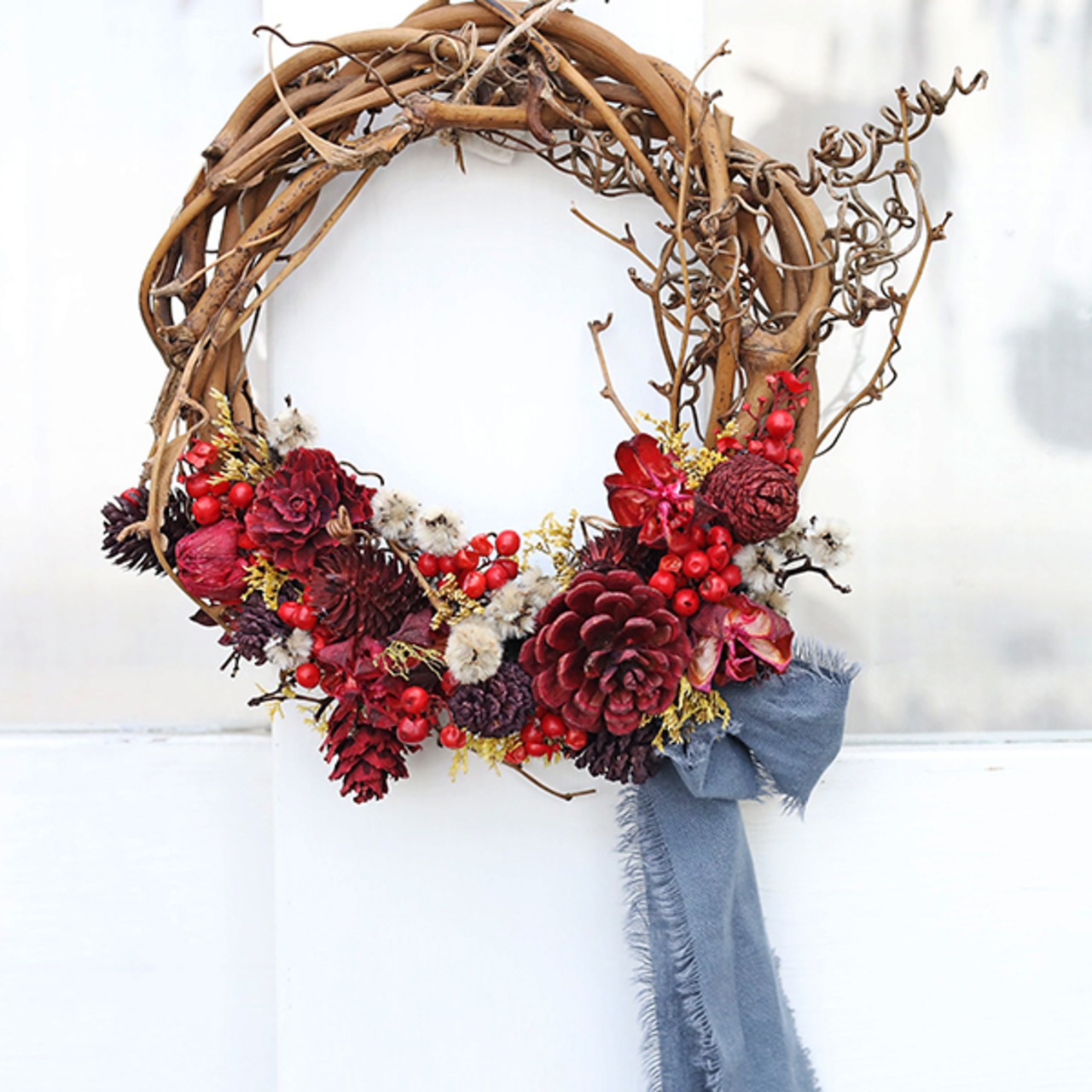 ドライ加工された天然素材の赤い木の実、ベリー、イエローのスターリンジャーなど使って作成しました。