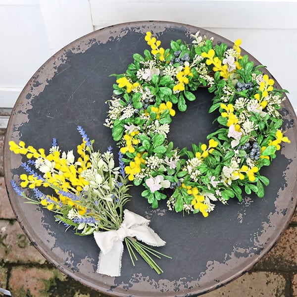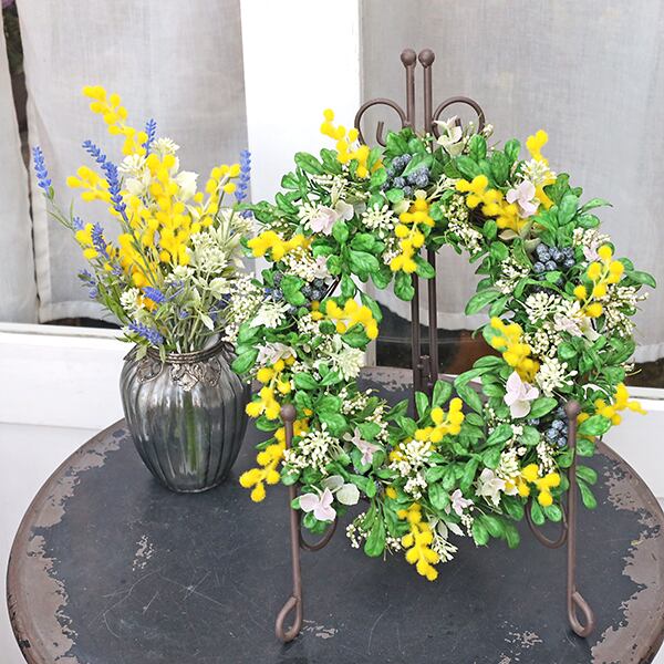 ミモザ、ブラックベリーをメインにグリーンやホワイトの小花を散らしてナチュラルな印象のリースに仕上げました。
