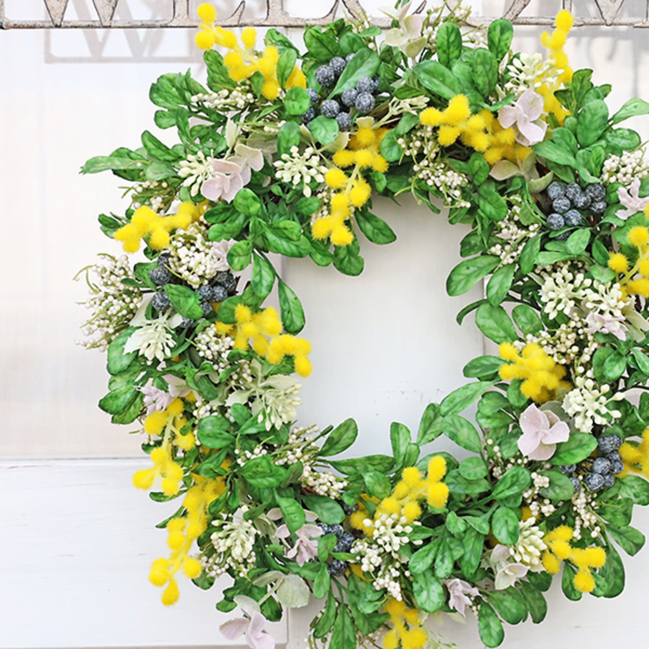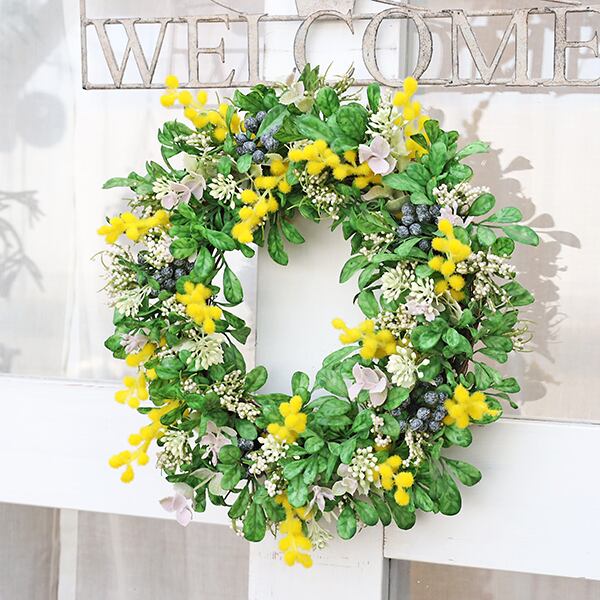 ミモザ、ベリー、オレガノ、ニュアンスカランコエホワイト、グリーンのアーティフィシャルフラワー(造花)のリースです。