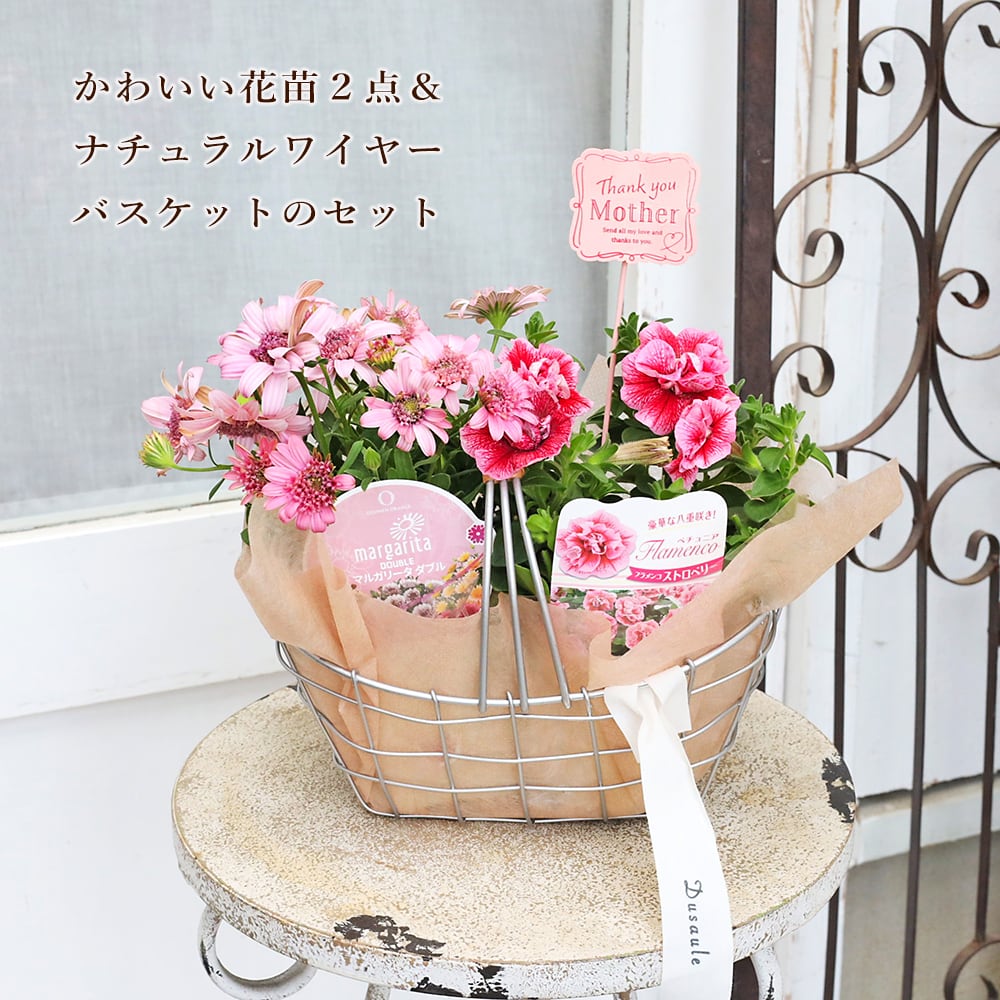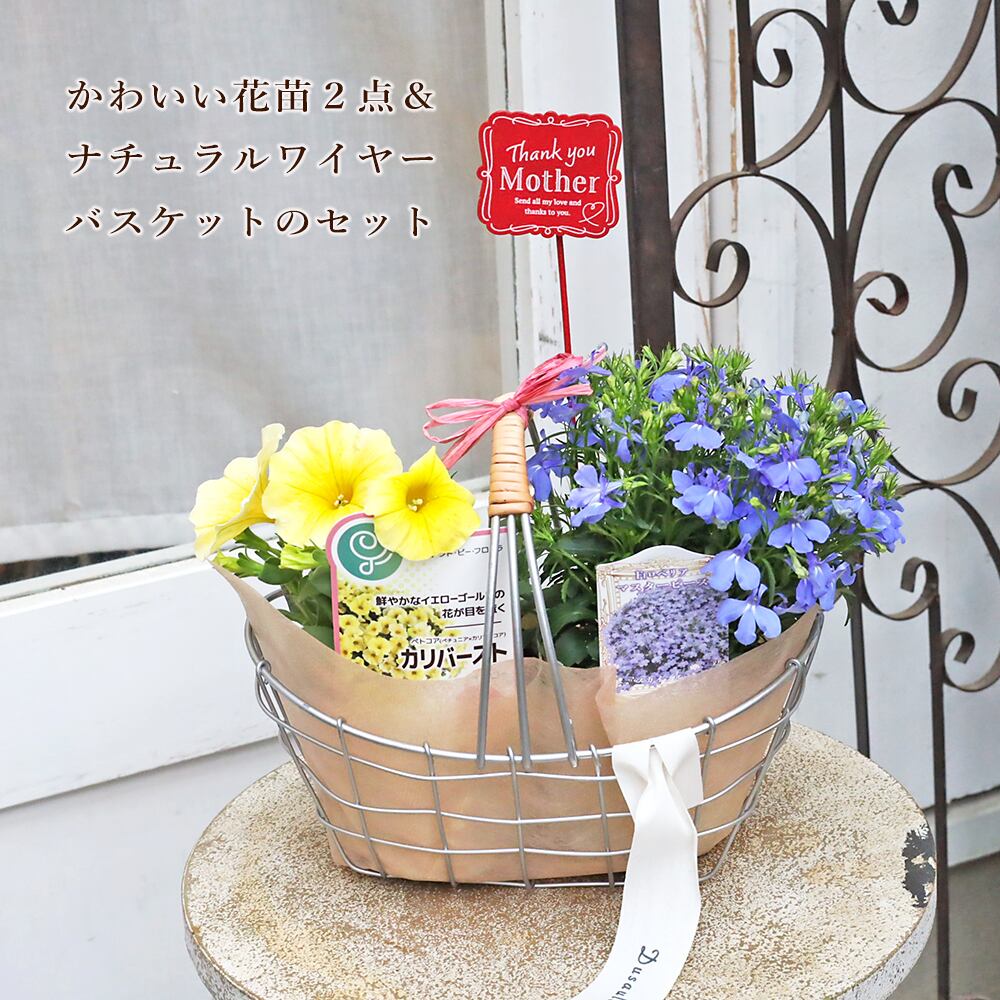 かわいい花苗2点&ナチュラルワイヤーバスケットのセット おしゃれ 華やか 寄せ植え 母の日 プレゼント ギフト