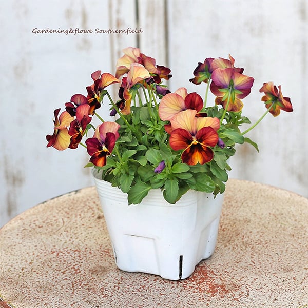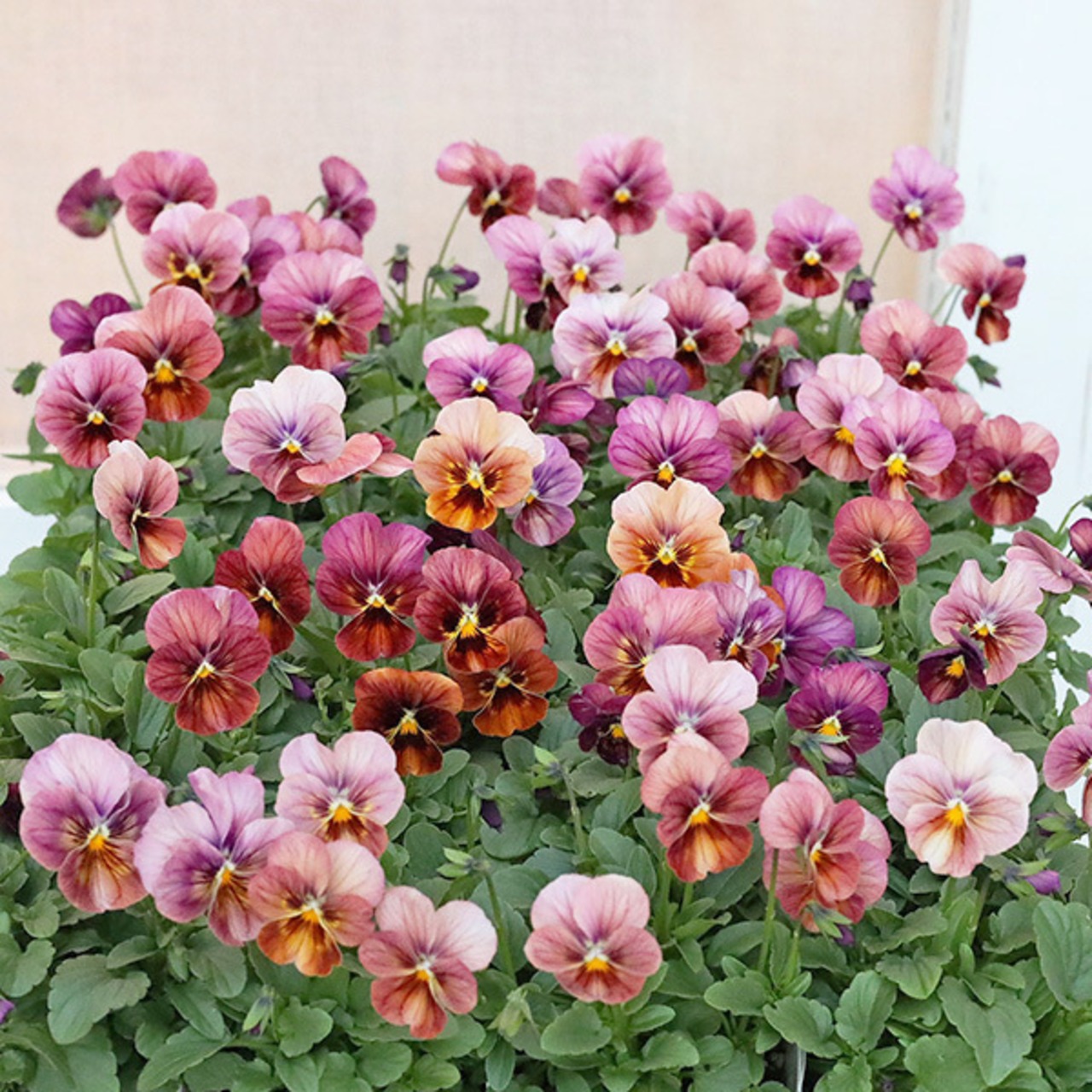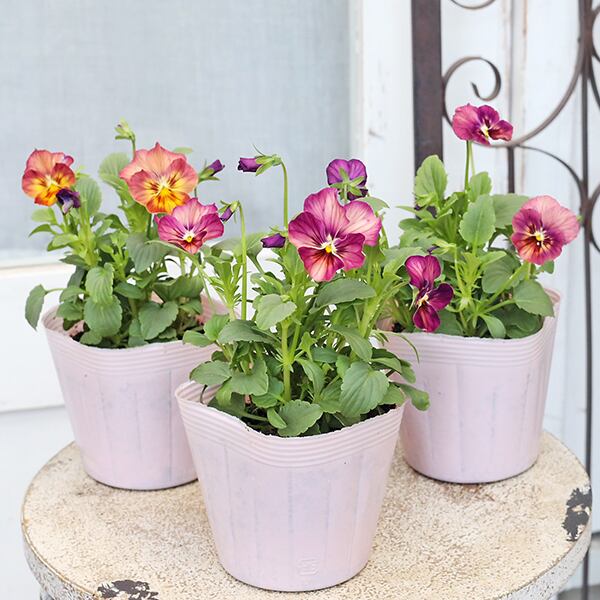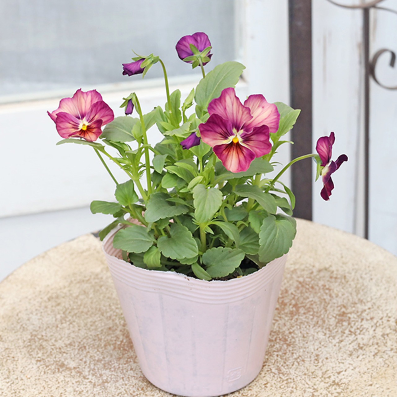 赤ピンク、ローズ系、アンティークタッチの色合いがステキなビオラです。